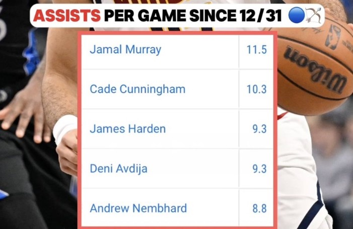 01月 15 2026 0 传球被低估?穆雷自约基奇伤缺以来场均11.5次助攻 同期联盟最多 xiaoqiao 2026-01-15 法甲 59 1月9日讯 昨天,掘金客场114-110险胜凯尔特人,取得两连胜。穆雷本场比赛出战37分钟18投8中,三分9中3,罚球4中3砍下22分8篮板17助攻,仅2次失误。据统计,自约基奇受伤以来,穆雷场均可以送出11.5次助攻,同期联盟最多。
